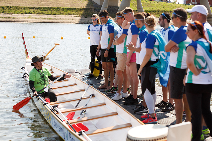 De trommelaar slaat op de trom, in het ritme van de voorste peddelaars. De rest van het team moet proberen dit tempo precies te volgen. Samenwerking is dus essentieel om zo snel mogelijk de finish te halen. Dat maakt het drakenbootvaren de ultieme teambuilding. Door zo intensief samen te werken, leer je elkaar nog beter kennen. Dat vertaalt zich terug naar de werkvloer. En bij een stads- en dorpsfeesten horen we altijd terug dat het drakenbootfestial zorgt voor meer saamhorigheid binnen het bedrijfsleven, buurten en verenigingen. Drakenbootvaren verbindt!